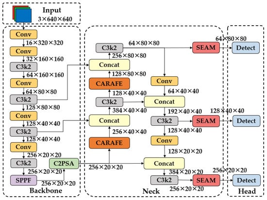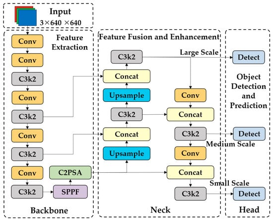 YOLOv11 [36], released by Ultralytics Inc. (London, UK) as the latest iteration in their YOLO series (e.g., YOLOv8), has garnered significant attention in the field of object detection for its remarkable accuracy and efficient processing speed. This model inherits and optimizes the architecture of its predecessors within the Ultralytics ecosystem by introducing a series of innovations. These include the C3k2 (Cross Stage Partial with kernel size 2) block, SPPF (Spatial Pyramid Pooling—Fast), and C2PSA (Convolutional block with Parallel Spatial Attention) components, which contribute to improving the model’s performance in several ways, such as enhanced feature extraction [37].