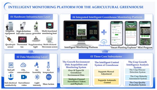 In this section, we present a comprehensive overview of the proposed CloudCropFuture platform, which collectively forms an efficient and intelligent agricultural management system designed to advance agricultural technology development and application. As shown in Figure 2, the overall architecture of the platform integrates a multi-layer design and diverse hardware devices, achieving intelligent agricultural management. It contains three core subsystems, i.e., the Growth Environment Data Acquisition and Monitoring System, the Intelligent Control System of Greenhouse, and the Crop Growth Intelligence Analysis System.