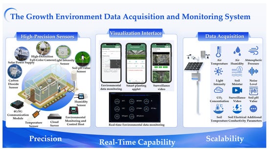 The Growth Environment Data Acquisition and Monitoring System integrates various high-precision sensors, HD full-color surveillance cameras, and other hardware equipment to achieve real-time monitoring and accurate assessment of agricultural production environments, shown in Figure 3. The system can monitor multiple critical environmental parameters including air temperature/humidity, soil conditions, and light intensity, among others. It demonstrates several notable advantages:
