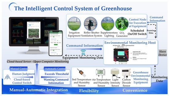 The Intelligent Control System of Greenhouse, based on IoT technology, utilizes environmental monitoring hosts and cloud platforms as core control units, and its framework is shown in Figure 4. By integrating actuators such as supplemental lights, CO2 generators, curtain ventilators, and irrigation equipment, it achieves precise regulation of key environmental parameters like light intensity and CO2 concentration within greenhouses.