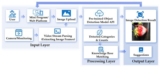 The system consists of three modules: the Crop Disease Detection System, the Crop Maturity Assessment System, and the Crop Quality Evaluation System. As illustrated in the workflow of Figure 5, users can upload crop images through the platform or extract image frames from surveillance videos (Input Layer). In the Processing Layer, the system calls on a pre-trained object detection model (YOLO-based) API. The model integration functions as follows: The pre-trained YOLO-based models are encapsulated as a callable API and deployed in the Processing Layer. When the system receives input images, it triggers this API. The API then uses the integrated pre-trained model to analyze the images. After analysis, the model generates image recognition results. These results are further matched with the knowledge base in the Processing Layer. Finally, in the Output Layer, the system feeds back image detection results (with visualized markings, e.g., bounding boxes on crops in images) and corresponding suggestions to the user through the platform.