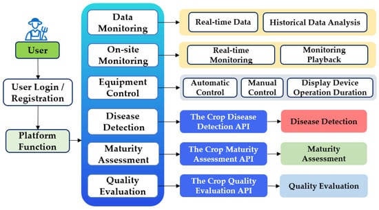 Specifically, for integrating the trained models into the platform, the trained object detection models, which are developed using datasets customized for specific crop types and application needs, are packaged into algorithmic APIs (namely the Crop Disease Detection API, the Crop Maturity Assessment API, and the Crop Quality Evaluation API, as shown in Figure 6). These APIs act as bridges between the models and the platform. When a user initiates a function like disease detection through the platform interface, the relevant API is triggered. The API then calls the corresponding trained model, transmits the input data to the model, and retrieves the model’s output (detection results). Finally, the API returns these results to the platform for display to the user. In this way, the trained models are seamlessly integrated into the platform’s functional architecture, enabling the end-to-end operation of functions from user request to result feedback.