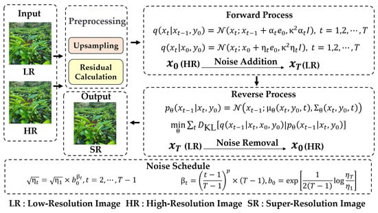 where represents the original high-resolution (HR) image, and represents the image obtained after the low-resolution image (LR) undergoes the upsampling operation. Based on this residual information, the model constructs an efficient Markov chain for the Forward Process as follows: