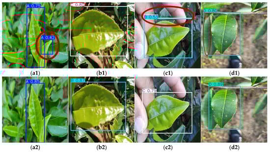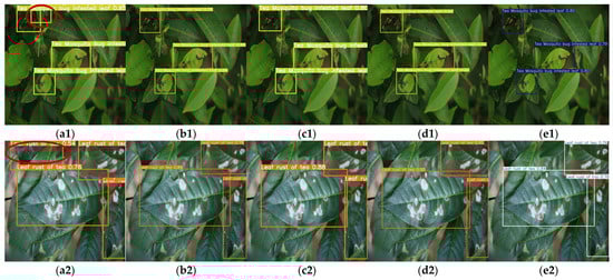 Detection results (with inaccuracies highlighted by red ellipses) of the Tea Leaf Disease Dataset via YOLOv11n and YOLOv11n-SC (proposed): (a1–d1) and (a2–d2) show the results of YOLOv11n and YOLOv11n-SC, respectively.