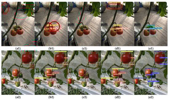 Detection results (with inaccuracies highlighted by red ellipses) of the Tomato Leaf Disease Dataset via YOLOv11n and YOLOv11n-SC (proposed): (a1–d1) and (a2–d2) show the results of YOLOv11n and YOLOv11n-SC, respectively.