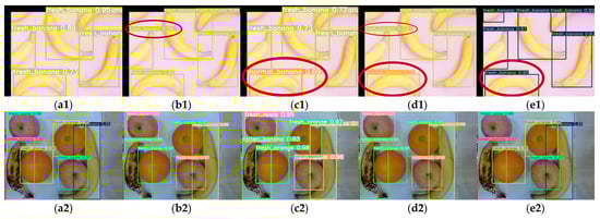 Detection results (with inaccuracies highlighted by red ellipses) of the Pepper Pest Dataset via YOLOv11n and YOLOv11n-SC (proposed): (a1–d1) and (a2–d2) show the results of YOLOv11n and YOLOv11n-SC, respectively.