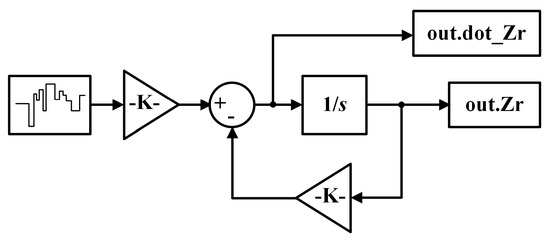 In the MATLAB/Simulink simulation platform, a random road input simulation model as shown in Figure 2 is established. The two gain modules in the model are and , respectively. Here, represents the output of the road’s vertical acceleration, and denotes the output of the road’s vertical displacement.