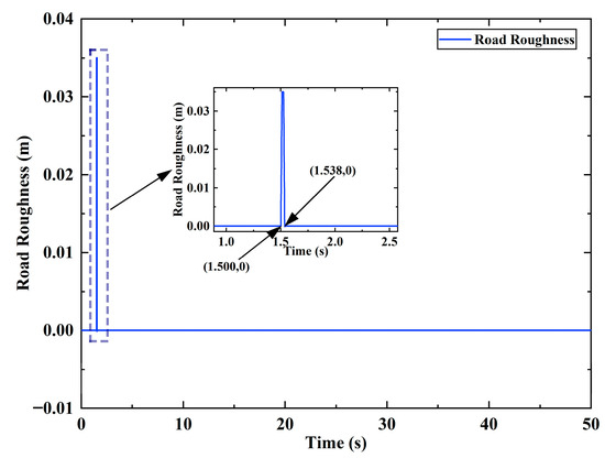 In this study, a simulation analysis was conducted using three different road surfaces: a speed bump road surface, a Class B road surface, and a Class C road surface. To ensure the validity of comparative assessments and reproducibility of results, road excitations were synthesized only once and maintained consistently across all simulations. The excitation for speed bumps was deterministic, whereas those for Class B and Class C roads were generated using fixed random speeds to preserve identical statistical properties. The vehicle traversed the speed bumps at 20 km/h and traveled over both Class B and Class C roads at 40 km/h. According to Table 2, the road power spectral density (PSD) values for Class B and Class C surfaces are m3 and m3, respectively, with a uniform cutoff frequency of Hz. The corresponding road excitation simulations are illustrated in Figure 3, Figure 4 and Figure 5.