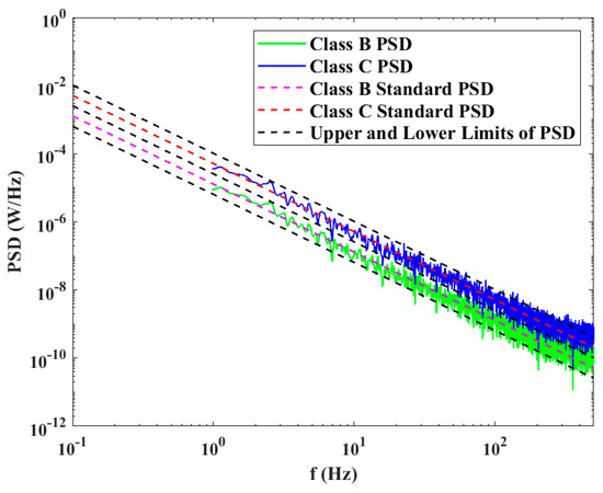 In order to verify the accuracy of the obtained random pavement excitation, the Welch algorithm was applied to simulate Class B and Class C road surfaces, as shown in Figure 6. The PSD of the simulated measured data were compared with the standard PSD curves, and the results showed that the power spectral densities of the pavements coincided with each other.