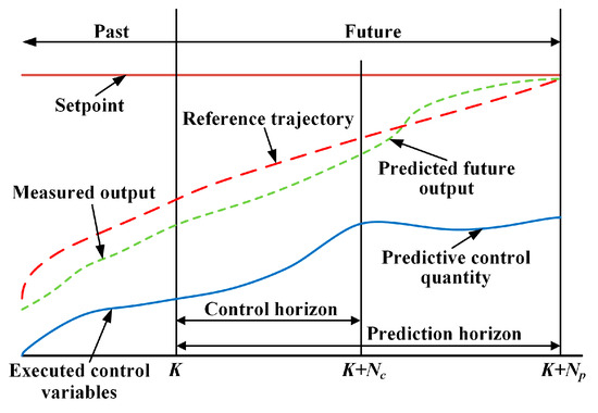 Model predictive control (MPC) originated in the 1970s and gradually matured in the early 21st century [20,21,22]. MPC is a control strategy that uses the method of the optimal problem to solve the control problem, which includes four major elements, namely, model prediction, rolling optimization, feedback correction, and reference trajectory. The control principles are illustrated in Figure 7.