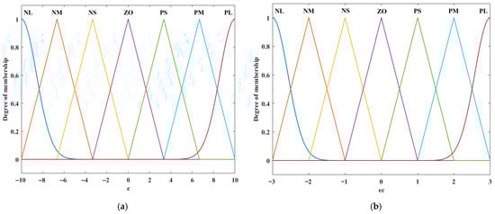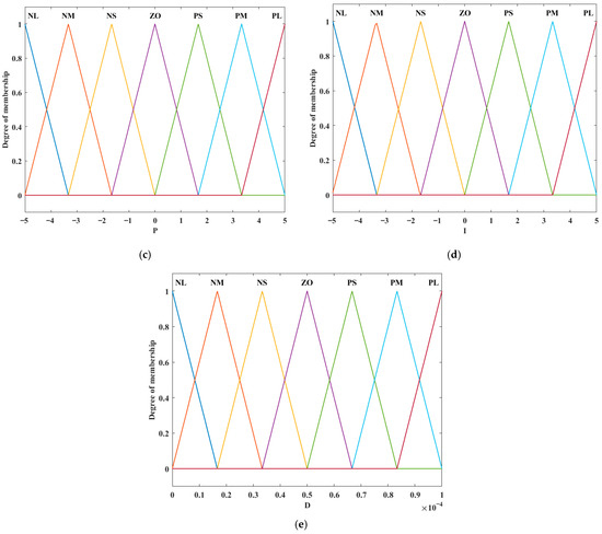 Based on the aforementioned theoretical analysis, the fuzzy subsets of input and output variables are categorized into seven levels, including negative large (NL), negative medium (NM), negative small (NS), zero (ZO), positive small (PS), positive medium (PM), and positive large (PL). Through iterative experiments, the fundamental domains were determined as follows: the deviation spans [−10, 10], its rate of change ranges within [−3, 3], while the base intervals for , and are, respectively, [−5, 5], [−5, 5], and [0, 0.0001]. The membership function curves for the input and output are illustrated in Figure 9.