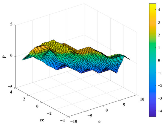 During the fuzzy control design process, the aggregation method adopts the maximum (max) principle, which involves performing a union operation on all fuzzy sets generated by the activated rules. Specifically, the maximum membership degree among these fuzzy sets at each point is selected as the resulting membership degree for that point. For defuzzification, the centroid method is utilized, calculating the center of gravity of the aggregated fuzzy set as the precise output value. This combination effectively integrates the influence of all rules, producing smooth and stable control outputs suitable for continuous damping force regulation in suspension systems. While proportional control within PID systems offers the advantage of rapidly suppressing deviations and effectively reducing their magnitude, excessively large proportional gains may lead to exacerbated system overshoot, thereby adversely impacting dynamic performance. Integral control helps eliminate steady-state errors, but due to its lagging nature, excessive use can easily cause system instability. Derivative control ensures the dynamic performance of the system [27,28]. Consequently, it is crucial to adjust the fuzzy adaptive PID control parameters based on the error and its rate of change. The specific operational methods are as follows: