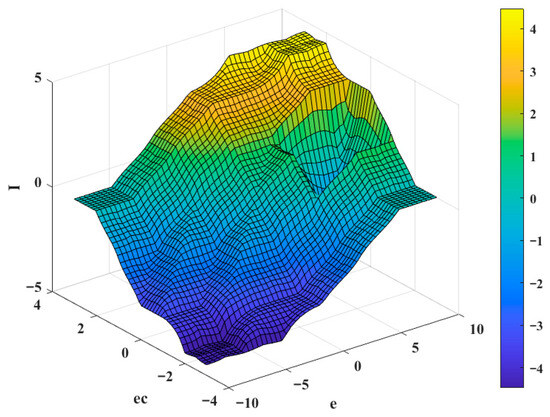 Control rules for , and in the fuzzy controller were formulated via algorithmic synthesis grounded in fuzzy theory, as detailed in Table 3, Table 4 and Table 5. Fuzzy decision-making was implemented using the centroid method, visualized in Figure 10, Figure 11 and Figure 12.