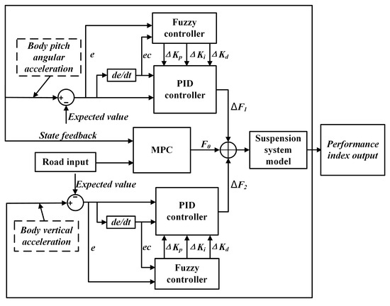 where is the control vector of the system and serves as the reference component within the system control vector , generated by the primary Model Predictive Control (MPC) controller. Fundamentally, this constitutes a two-dimensional vector , corresponding to the damping force outputs for both the front and rear suspensions. The complete control effort is formulated as , where and denote the compensatory outputs from the fuzzy adaptive PID secondary controllers.