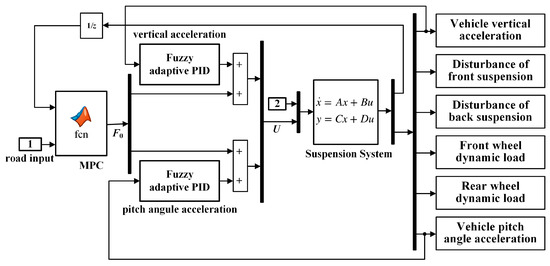 In order to verify the effectiveness and superiority of the proposed fuzzy adaptive PID-MPC control strategy, this study compares traditional passive suspension, uncorrected MPC strategy, and the PID-MPC strategy with the fuzzy adaptive PID-MPC strategy proposed in this study in detail. The simulation model of the semi-car semi-active suspension system based on fuzzy adaptive PID-MPC control shown in Figure 14 is built in the MATLAB/Simulink platform. To further comprehensively capture the ride comfort characteristics of the vehicle during its operational process, the body vertical acceleration, pitch angle acceleration, suspension dynamic deflection and wheel dynamic load are selected as the key evaluation indexes of the suspension system performance. And the root mean square (RMS) is used as the evaluation standard to quantify the influence of each control strategy on the performance of the suspension system.