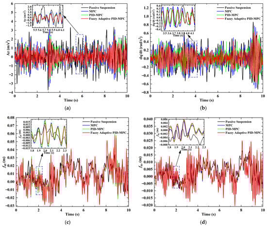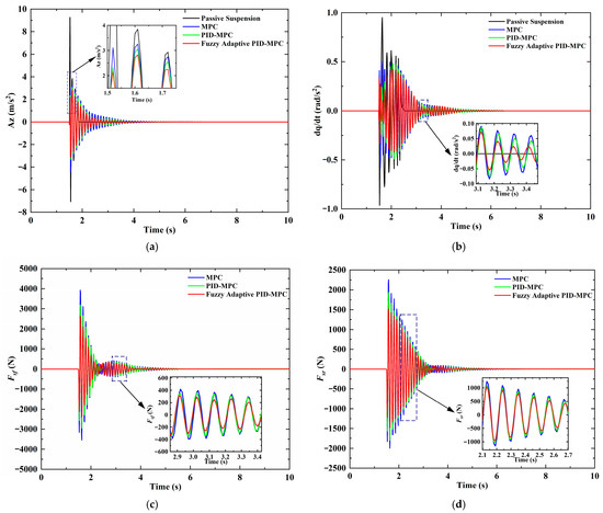 As can be seen from Table 6, the fuzzy adaptive PID-MPC strategy demonstrates the best control performance in terms of vertical acceleration and pitch angular acceleration of the vehicle body. Compared with the passive suspension, the RMS values of vertical acceleration are reduced by 15.91%, 28.81%, and 36.10% under the MPC, PID-MPC, and fuzzy adaptive PID-MPC strategies, respectively. Similarly, the RMS values of pitch angular acceleration are reduced by 14.60%, 27.38%, and 33.67%, respectively. Figure 15a,b further illustrate that all three active control strategies significantly reduce the peak accelerations and effectively suppress shock responses compared to the passive suspension, with the most notable peak reduction achieved by the fuzzy adaptive PID-MPC strategy. Furthermore, Figure 15c,d present the corresponding front and rear suspension control forces, showing that the fuzzy adaptive PID-MPC strategy produces smoother and more stable damping trajectories compared with MPC and PID-MPC. This avoids abrupt fluctuations while still providing sufficient force to suppress the vibration peaks induced by the speed bump.