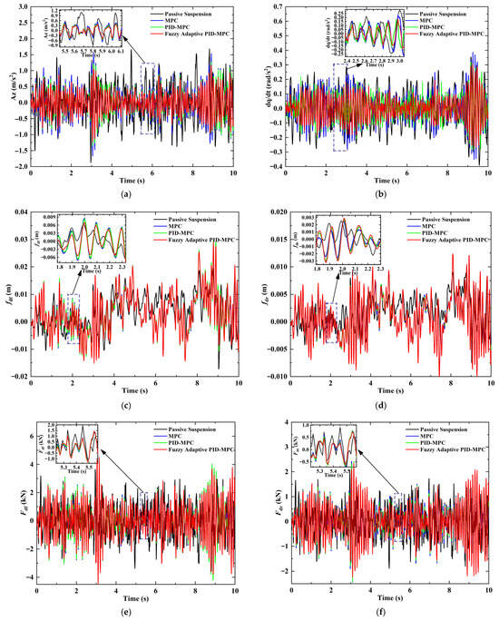 It should be noted that due to the inherent conflicts between ride comfort and driving safety, as well as between comfort and suspension dynamic travel, a moderate increase in suspension dynamic deflection and tire dynamic load is an expected phenomenon under the control objectives of ensuring ride comfort and safety. The fuzzy adaptive PID-MPC control strategy proposed in this study enables the achievement of enhanced vehicle ride comfort across diverse operating conditions through flexible fuzzy rule design and parameter tuning, thereby providing an effective technical pathway for subsequent optimization of suspension system overall performance.