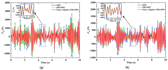The simulation results under a Class B road surface are shown in Figure 16 and Table 7. Compared to the passive suspension, the uncorrected MPC, PID-MPC, and fuzzy adaptive PID-MPC strategies reduced the RMS values of the vehicle body vertical acceleration by 19.14%, 30.38%, and 38.19%, respectively, and those of the pitch angle acceleration by 18.50%, 31.92%, and 37.47%, respectively. This demonstrates that the fuzzy adaptive PID-MPC strategy can more accurately track road irregularities, proactively generate control signals through model prediction, mitigate the impact of road excitations on the vehicle body, effectively suppress pitch vibrations, and significantly improve ride comfort during driving. In addition, Figure 16g,h illustrate the damping force outputs of the front and rear suspensions. Compared with the abrupt variations observed under MPC and the partial improvement under PID-MPC, the fuzzy adaptive PID-MPC strategy yields the most continuous and stable control forces. These smoother outputs better match the dynamic characteristics of magnetorheological (MR) dampers and correspond to the superior reduction in vertical and pitch accelerations shown in Table 7.