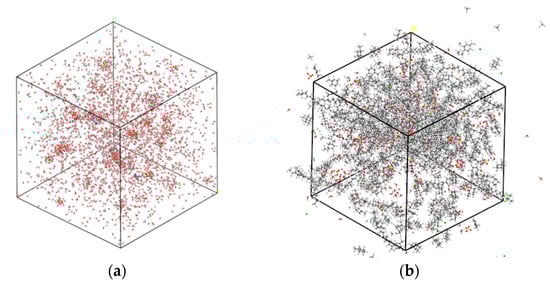 Before establishing the CH4-drilling fluid system, it is necessary to construct water-based/oil-based drilling fluid models. The configuration of the water-based drilling fluid is shown in Figure 1a. It is mainly composed of a water phase, BaSO4 (weighting agents), Fe2O3 (substituted by Fe2+ for modeling purposes), Sodium lignosulfonate (a dispersant, CHNa2OS2), Polyacrylamide (a viscosity-increasing agent, (C3H5NO)ₙ), and water, etc. In this water-based drilling fluid system, there are 10 CH4 molecules, and the total number of molecules is 1044. Figure 1b depicts the configuration of the oil-based drilling fluid, which consists of an oil phase (paraffinic, 0.85 g/cm3 at 20 °C), BaSO4 (weighting agents), Fe2O3 (substituted by Fe2+), Polyoxyethylene lauryl ether (an emulsifier, C12H25O(C2H4O)23H, average EO number 23, HLB 16.9), etc. In this oil-based drilling fluid system, there are 10 CH4 molecules, and the total number of molecules is 843.
