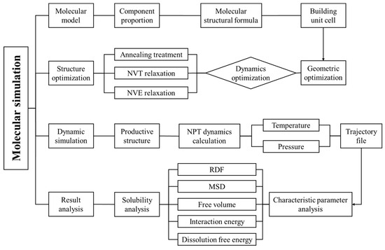 Molecular dynamics simulation is based on Newton’s laws, and solves the motion behavior of particles under mutual interactions through numerical integration. The basic steps of molecular dynamics simulation include the following: ① initializing the positions and velocities of particles; ② calculating the forces between particles through potential energy functions; and ③ using numerical methods to solve the equations of motion and updating the positions and velocities of particles.