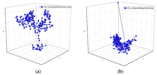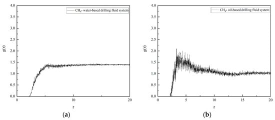 The radial distribution function (RDF) curves of CH4 and water molecules (H2O) in different systems are shown in Figure 7. By examining the RDF curves, it is evident that they exhibit a single-peak shape. This implies that in oil-based drilling fluids, an aggregation layer of water molecules forms around CH4 molecules, indicating the presence of a stable hydration layer. In contrast, the RDF curve in water-based drilling fluids shows no distinct peaks or troughs, suggesting that there is no significant interaction between CH4 molecules and water molecules in water-based drilling fluids, and no solvation structure is formed.