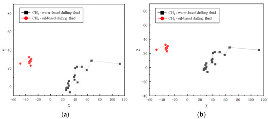 Movement track of CH4 in drilling fluid: (a) X-Y plane; (b) X-Z plane.