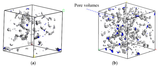The CH4-drilling fluid model was scanned using the scanning probe method, with the kinetic radius of methane molecules (0.2–0.21 nm) serving as the hard-sphere probe (as shown in Figure 8). The free volume within each system was estimated to calculate the free volume fraction, thereby enabling a microscopic analysis of solubility. Based on the analysis results, it was found that there were fewer fillable voids in water-based drilling fluids, and these voids were more dispersed in distribution. In contrast, oil-based drilling fluids had more concentrated voids.