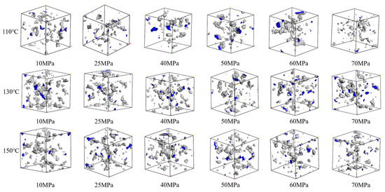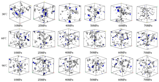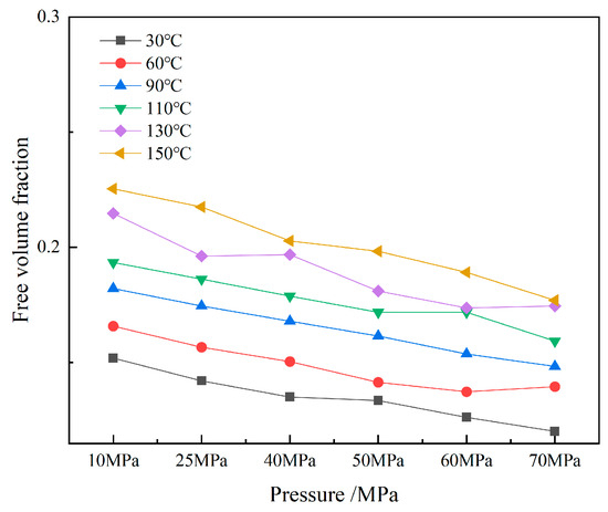 The volume distributions of various components in the CH4-water-based drilling fluid system unit under different temperature and pressure are presented in Table 6. Figure 10 displays the free volume distribution of the CH4-water-based drilling fluid system unit under varying pressure and temperature. Figure 11 shows the trend of changes in the free volume fraction. The results indicate that temperature has a particularly significant impact on the free volume fraction. As the temperature rises, the thermal motion of molecules intensifies, leading to an increase in the intermolecular spacing and a notable rise in the free volume fraction. Under high temperature, the intermolecular forces weaken, and the overall available space in the system increases, which is conducive to gas diffusion and solubility. In contrast, when the pressure increases, the distance between molecules decreases, and the system tends to be more closely packed, resulting in a slight decrease in the free volume fraction. The synergistic effect of temperature and pressure directly influences the microscopic structure of the system and the gas solubility behavior.