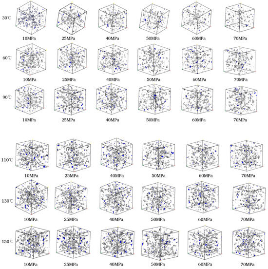 For the molecular simulation, the tested temperature range is 30~150 °C, and the pressure range is 10~70 MPa, which roughly corresponds to a maximum well depth of 7000 m and covers most of the conditions encountered during drilling. In the simulation, a total of 30 cases are conducted, with the combination of 5 temperature points (30 °C, 60 °C, 90 °C, 110 °C, 130 °C, 150 °C) and 6 pressure points (10 MPa, 25 MPa, 30 MPa, 40 MPa, 50 MPa, 60 MPa).