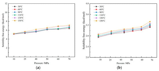 The solubility free energy of CH4 molecules in drilling fluid increases with rising pressure, while the influence of temperature is relatively small, showing an overall slight upward trend. Solubility free energy reflects the energy required for a gas to transition from the gaseous state to the dissolved state. As both temperature and pressure increase, the solubility free energy rises, indicating that the dissolution process becomes more difficult. However, the gas solubility still increases significantly with rising pressure (as shown in Figure 15). Therefore, solubility free energy is not the main factor contributing to differences in gas solubility.