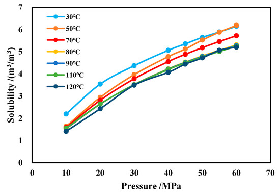The effects of temperature and pressure on CH4 solubility are illustrated in Figure 16. It can be observed that, under the same conditions, the solubility of CH4 increases with rising pressure and decreases slightly with increasing temperature.