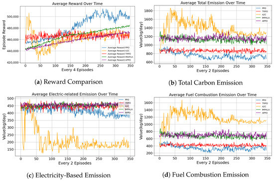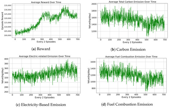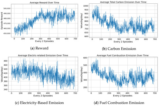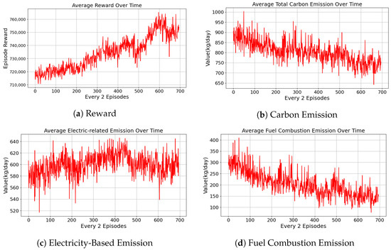 - Electric Vehicle Carbon Emission: For each electric vehicle, carbon emission is estimated based on its electricity consumption. Given the energy usage (in kWh) at time step t, the emission is computed as:where is the carbon intensity coefficient of the electricity grid (e.g., kg CO2 per kWh).