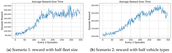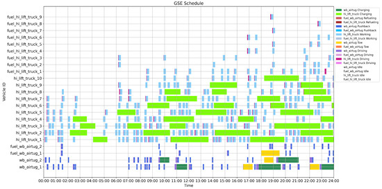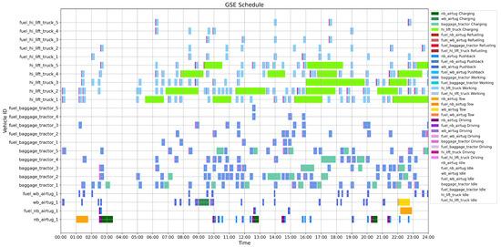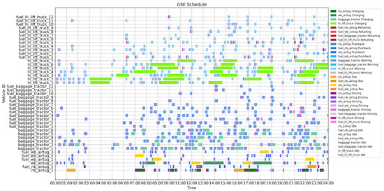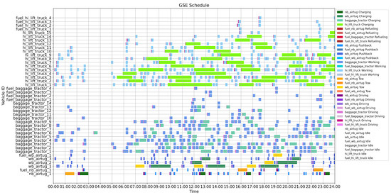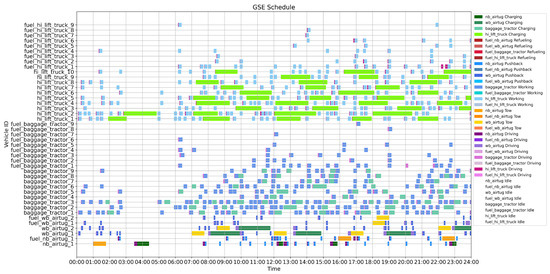 - The framework supports large-scale and multi-type vehicle fleets, capturing the diverse operational demands of airport ground services. This design enhances the model’s scalability and applicability to real-world scheduling scenarios.