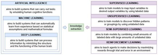 Schematic representation of the relationship between artificial intelligence and learning frameworks in relation to knowledge extraction. On the one hand, artificial intelligence provides practical implementations to perform knowledge extraction tasks through various algorithms, whose hierarchical nature reflects a progressively refined processing logic, as shown by ML models (based on mathematical formulas and statistical assumptions) and DL models (based on artificial neural networks), which can accommodate different learning perspectives. On the other hand, learning frameworks provide theoretical guidance to solve knowledge extraction tasks based on the research objective and the available data, regardless of the selected computational approach.