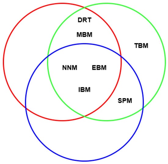 Schematic graphical representation denoting the distribution of the models mentioned in section tables (see Table 1, Table 2, Table 3 and Table 4) across the research domains discussed in this review, namely, human health (red circle), animal husbandry (green circle), and aquaculture (blue circle). For conciseness and interpretability, mentioned models have been grouped into the following high-level categories: tree-based models, TBM (decision tree, DT); ensemble-based models, EBM (random forest, RF; random block, RB; extra tree, ET; gradient boosting, GB; extreme gradient boosting, XGB; adaptive boosting, AB; categorical boosting, CB); margin-based models, MBM (support vector machine, SVM); instance-based models, IBM (k-nearest neighbors, k-NN; partitioning around medoids, PAM); neural network models, NNM (feedforward neural network, FNN; convolutional neural network, CNN; long short-term memory, LSTM; You Only Look Once, YOLO; adaptive neuro-fuzzy inference system, ANFIS; bidirectional encoder representations from transformers, BERT; transformers); statistical and probabilistic models, SPM (Gaussian Naïve Bayes, GNB; Bayesian network, BN; logistic regression, LR); dimensionality reduction techniques, DRT (principal component analysis, PCA; principal coordinate analysis, PCoA; multidimensional scaling, MDS; non-metric multidimensional scaling, NMDS; non-negative matrix factorization, NMF; partial least squares discriminant analysis, PLS-DA).