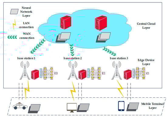 The origin of deep neural network tasks is always the user equipment, and the input data always exists directly in the terminal device [26]. When terminal devices need to send computing requests to edge servers or cloud servers, they need to transmit data to the corresponding devices through a Wide Area Network (WAN) or a Local Area Network (LAN). After receiving the data, the edge server or cloud server performs calculations and sends the calculation results to the next device. After several rounds of calculations, the final calculation results need to be transmitted back to the terminal device. The distance between the terminal device and the edge server is relatively close, and the data is transmitted between the two pairs through the LAN, while the cloud server is far away from the terminal device and the edge server, and the data is transmitted between the two pairs through the same WAN [27], as shown in Figure 1. This paper deploys the complete DNN model layers to various computing resources in the mobile edge computing environment.