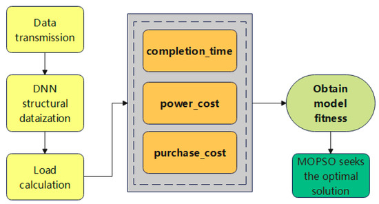 In the offloading strategy model, there are issues related to data transmission between different devices, data representation of deep neural network hierarchical structures, and load calculation at various levels of deep neural networks. When using multi-objective optimization algorithms based on particle swarm optimization, it is necessary to calculate the fitness values of particles. A specific fitness value calculation method model is established based on the calculation time, equipment configuration cost, and energy consumption of the deep neural network determined by the objective function. The DNN structure digital model and load calculation model used in the system model are used as auxiliary models to establish a simulation offloading platform. Different deep neural network structures are converted into specific topological matrices, and the floating-point calculation amount of each layer is determined through the load calculation model to simulate the specific offloading scenario realistically and assist in calculating the specific offloading plan.