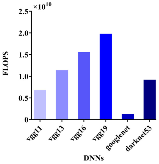 The graph of the number of floating-point operations for the six different deep neural networks is shown in Figure 9, where VGG19 has the highest number of floating-point operations, and googlenet has the lowest number of floating-point operations. This indicates that as the structure of the network is more complex, it requires more computational resources to complete, which leads to longer execution time, especially on end devices with limited computational power; the more computation, the more energy consumed by the device, which leads to a shorter battery life of the end device.