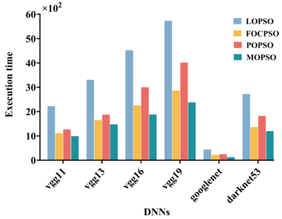 From Figure 10, it can be clearly seen that as the network structure becomes more complex, the execution time of all algorithms also increases. Specifically, the local execution scheme showed the most significant increase in execution time, indicating its low efficiency under higher computational loads. Compared to it, the MOPSO algorithm demonstrated a more stable performance advantage throughout the entire process, with the lowest execution time. The optimization strategy proposed in this article is more efficient in terms of execution time compared to the local execution (LOPSO) scheme, the cloud completely offloading (FOCPSO) scheme, and the end–cloud (POPSO) optimization scheme: The execution time was reduced by 55.4%, 10.7%, and 21.6%, respectively, in the VGG11 neural network environment. The execution time was reduced by 55.2%, 10.4%, and 20.9%, respectively, in the VGG13 neural network environment. The execution time was reduced by 58.1%, 16.2%, and 36.9% in the VGG16 neural network environment, respectively. The execution time was reduced by 56.5%, 13.1%, and 37.9%, respectively, in the VGG19 neural network environment. The execution time was reduced by 59.0%, 18.0%, and 27.4%, respectively, in the Googlenet neural network environment. The execution time was reduced by 52.8%, 5.7%, and 29.6%, respectively, in the Darknet53 neural network environment.