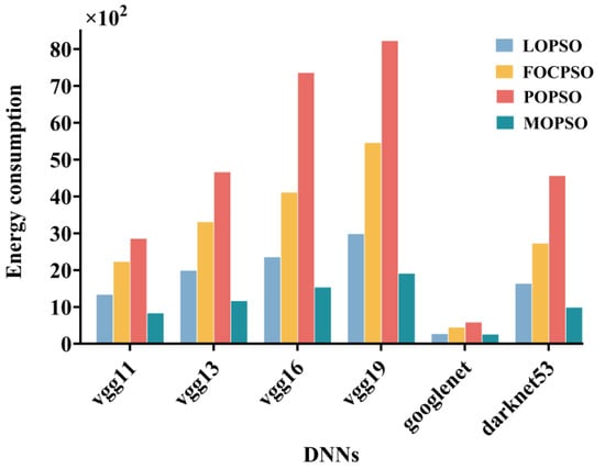 It can be clearly observed from Figure 11 that as the complexity of the neural network increases, the energy consumption of all optimization algorithms also increases. Specifically, the POPSO algorithm exhibits the most significant energy consumption under high computational loads. In contrast, the MOPSO algorithm consistently maintains the lowest energy consumption among all tested networks, while meeting normal communication requirements and bringing certain cost reduction and efficiency improvement benefits. In the VGG11 neural network environment, energy consumption was reduced by 37.77%, 62.65%, and 70.90%, respectively. In the VGG13 neural network environment, energy consumption was reduced by 41.42%, 64.84%, and 75.08%, respectively. In the VGG16 neural network environment, energy consumption was reduced by 34.80%, 62.73%, and 79.12%, respectively. In the VGG19 neural network environment, energy consumption was reduced by 36.18%, 65.09%, and 76.80%, respectively. In the Googlenet neural network environment, energy consumption was reduced by 5.43%, 43.27%, and 57.14%, respectively. In the Darknet53 neural network environment, energy consumption was reduced by 39.77%, 63.86%, and 78.36%, respectively.