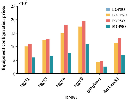 The comparison chart of cloud configuration prices for six different deep neural networks is shown in Figure 12. Local offloading does not use cloud services, so there is no cloud configuration cost. Compared to the other three strategies, it can be found that MOPSO has lower cloud configuration costs on the six deep neural networks than the other two offloading strategies, which has a significant improvement effect on saving cloud configuration prices. This is because MOPSO can choose the appropriate cloud server type and rental method based on the computing and data volume of the task, such as on-demand or yearly rental, thereby reducing cloud configuration costs.