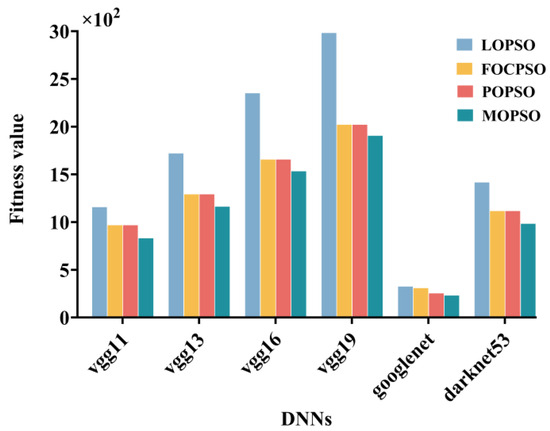 Compare the fitness values of the optimization scheme proposed in this article with the local execution scheme, cloud complete uninstallation scheme, and end–cloud partial uninstallation scheme: In the VGG11 neural network environment, the fitness values decreased by 28.20%, 14.13%, and 14.13%, respectively. In the VGG13 neural network environment, the fitness values decreased by 32.44%, 10.07%, and 10.07%, respectively. The fitness values of VGG16 decreased by 34.80%, 7.42%, and 7.42%, respectively, in the network environment. In the VGG19 neural network environment, the fitness values decreased by 36.14%, 5.72%, and 5.72%, respectively. In the Google Net neural network environment, the fitness values decreased by 9.10%, 18.94%, and 1.38%, respectively. In the darknet53 neural network environment, the fitness values decreased by 30.54%, 11.97%, and 11.97%, respectively.