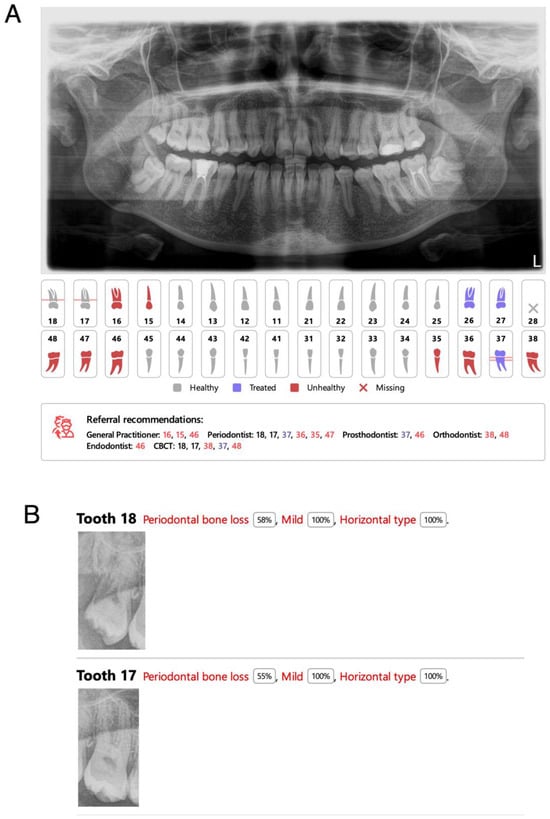 Representative panoramic radiograph (PR) showing diagnoses automatically generated by Diagnocat (DGNCT LLC, Miami, FL, USA; version 1.0). Diagnocat report including simple diagram of teeth with a legend of findings and referral recommendations pointing specific specialists for specific teeth (A). Diagnocat report including specific teeth captions and description with percentage of accuracy (B).