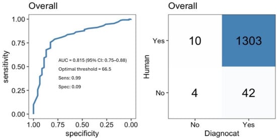 Diagnocat demonstrated a remarkably high sensitivity of 99.2%, effectively identifying nearly all cases classified as “condition present” by human evaluators (Figure 2). However, it exhibited low specificity, at approximately 9%, meaning it rarely predicted “no condition” when the condition was truly absent. The overall correct classification rate was impressive, achieving an accuracy of 96%, largely attributable to the high prevalence of dental conditions among the evaluated teeth. Supplementary Figure S1 displays the P–R curve, which offers a clearer view of overall performance under class imbalance. The confusion matrix provided further insight into the model’s performance, showing true positives (TP): 1303; false negatives (FN): 10; false positives (FP): 42; true negatives (TN): 4.