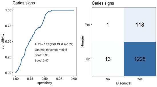 ROC curve illustrating the diagnostic performance of the model for detecting caries signs, with AUC, optimal threshold, sensitivity, and specificity values. The accompanying confusion matrix compares model predictions with human assessments and is based on a condition-specific subset of the sample, including only teeth that met the predefined evaluability criteria.