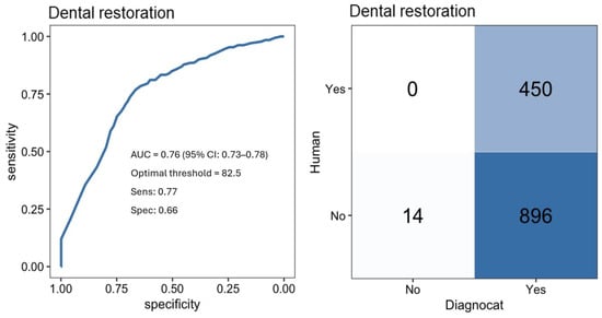 In terms of detecting dental restorations, Diagnocat also displayed moderate discriminative ability, with an AUC of 0.76 (Figure 4). At the selected threshold, the model reached a sensitivity of 77%, successfully detecting most cases with restorations. Its specificity was. 66%, indicating a fair ability to recognize teeth without restoration. Supplementary Figure S3 displays the P–R curve for dental restoration, offering a clearer view of performance under class imbalance. The confusion matrix indicated 450 TP, 0 FN, 896 FP, and 14 TN.