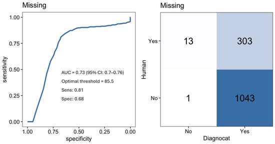 For the detection of missing teeth, Diagnocat’s performance remained moderate, with an AUC of 0.73 (Figure 5). It showed a high sensitivity of 0.81, indicating strong detection of missing teeth, although its specificity was lower at 0.68. Supplementary Figure S4 displays the P-R curve for missing teeth, offering a clearer view of performance under class imbalance. The confusion matrix showed 303 TP and 13 FN, alongside 1043 FP and 1 TN.