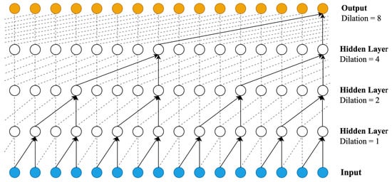 Architecture of a dilated causal convolutional network. Convolutional layers with increasing dilation factors progressively enlarge the receptive field while preserving causality for long-range dependency modeling [39].