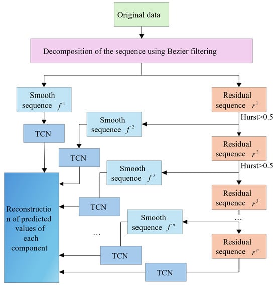 Since most metal futures are inherently non-stationary signals, we propose a decomposition-then-prediction hybrid model called the Bézier–Hurst–TCN (BH-TCN) model to handle such non-stationary signals. The optimal parameters for each Bézier layer to achieve better decomposition performance can be determined by grid search. The cumulative chord length parameterization technique is employed to determine the corresponding parameter for each individual data point. Subsequently, a novel hybrid model is applied to forecast each subsequence, aiming to enhance the overall predictive accuracy. The structural framework of the proposed algorithm is illustrated in Figure 3, with the detailed steps outlined below.