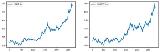 This study uses the closing prices of metal futures as the primary dataset, with data sourced from https://cn.investing.com (accessed on 18 March 2025) and shfe.com.cn (accessed on 15 March 2025). To assess the forecasting capabilities of the BH-TCN model across varying market environments and degrees of price volatility, gold futures data from both the Shanghai Futures Exchange (SHFE) and the New York Commodity Exchange (COMEX) were chosen as the focus of this study. The analysis focuses on the most liquid contracts traded on each exchange. The empirical dataset consists of daily closing prices across all continuous trading days from 2014 to 2024, as shown in Figure 4. In this plot, the x-axis corresponds to the trading day index, while the y-axis shows the associated closing price.